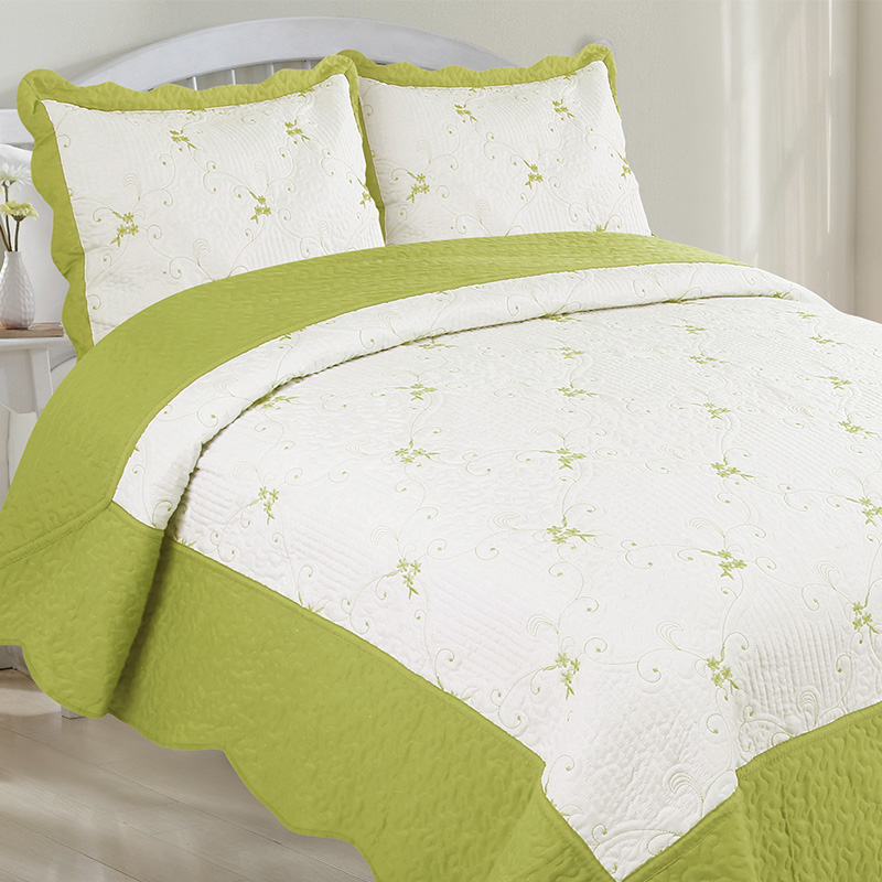 A hímzőtakaró a középső részhez és a külső szegélyekhez illeszthető lapos élekkel. A hímzés színe megegyezik a szegélyszövet színével. A pamut töltettel ellátott ágytakaró elég nehéz ahhoz, hogy melegen tartsa, és a paplan nyáron is könnyű. Bármilyen szín elérhető.